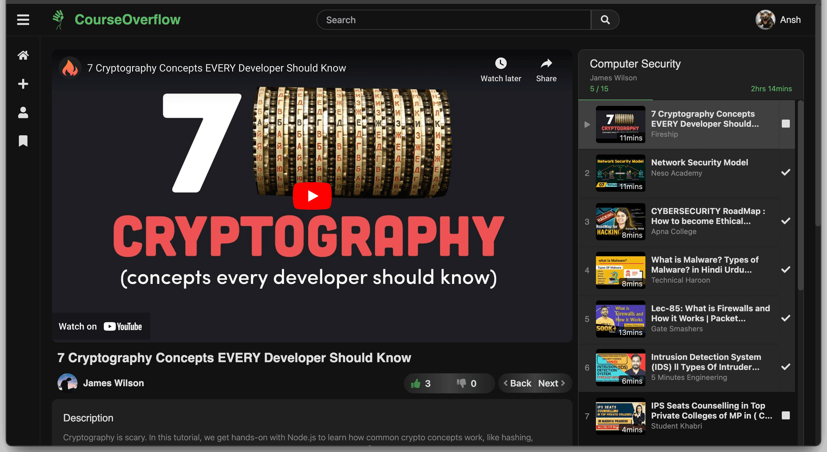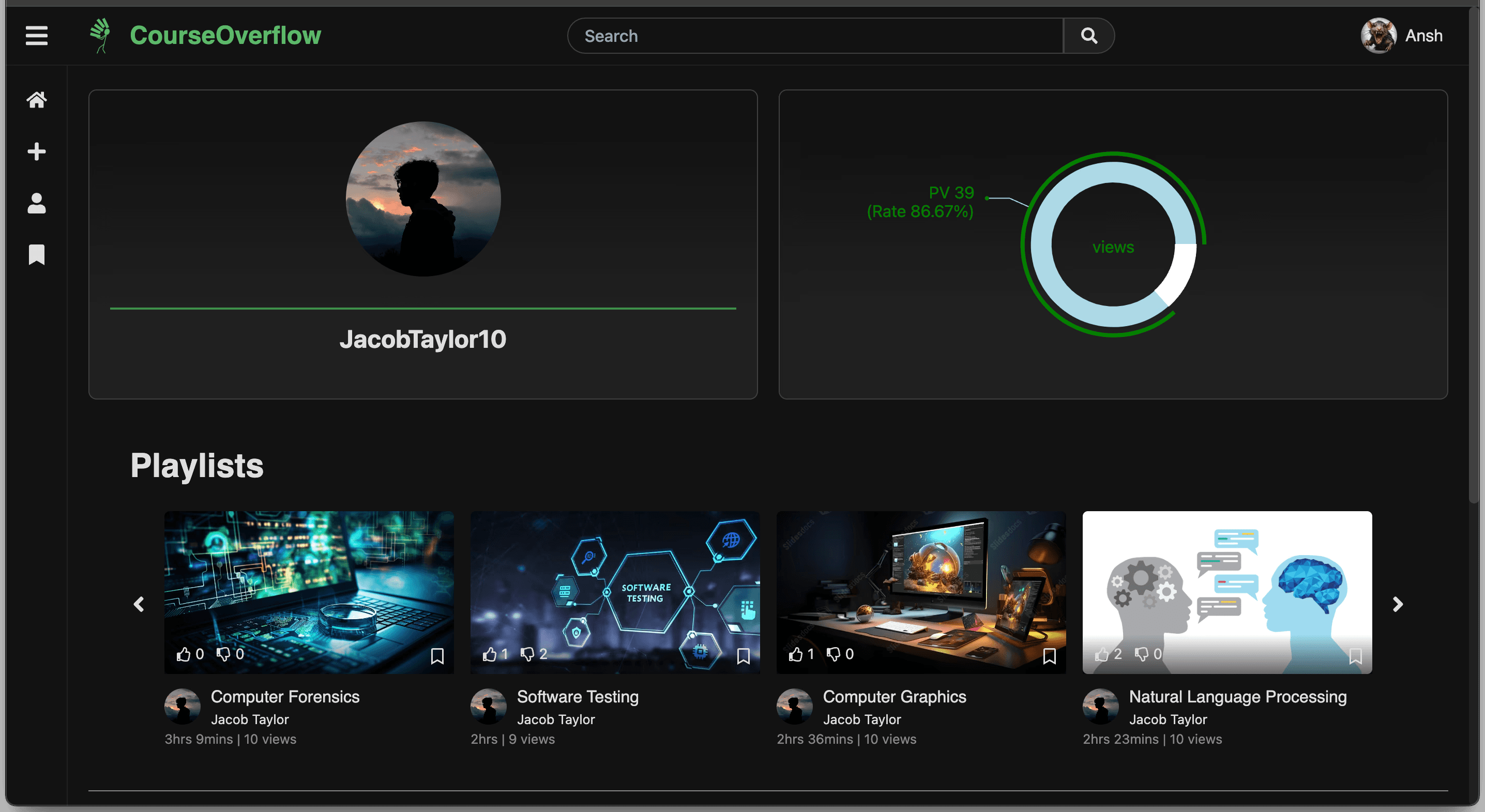The final web application offers a user-friendly experience, allowing users to tailor their learning. By liking or disliking videos, users can receive better recommendations for future content. The bookmark feature provides the flexibility to learn at their own pace by saving videos for later viewing. Users can explore profiles to discover playlists from their favourite creators or friends, enhancing community learning. Additionally, the app includes a comment section, encouraging discussions and collaboration. An analytical dashboard gives users insights into their viewing habits, tracking progress and offering personalised metrics for better learning management.